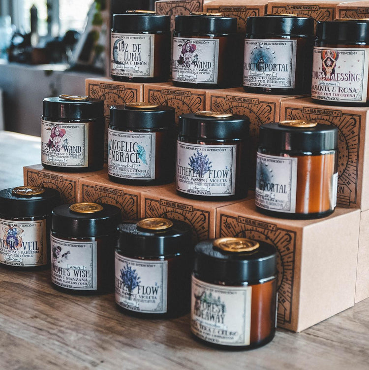 Velas veganas (coco+carnauba) aromatizadas con los principios de la Aromaterapia Mágica y bendecidas con cristales según la Gemoterapia. Incluyen afirmación a repetir y un ritual específico según la vela que escojas.